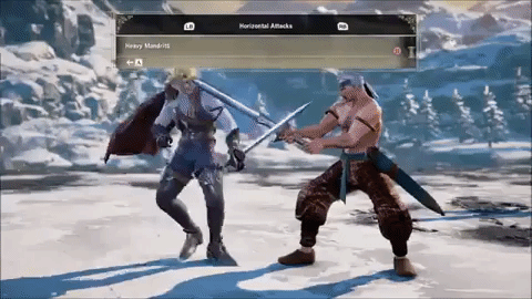 A version: high, horizontal spin. B: low, ankle swipe. C: overhead, hilt smack.